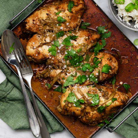- Vänd ev kycklingen någon gång under tiden eller skeda över vätskan från plåten. Servera kycklingen med tortillabröd, vitkål och koriander.