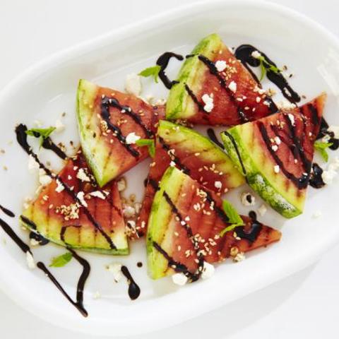 En vannmelon inneholder hele 93 prosent vann, så de fleste blir overrasket når jeg foreslår å legge den på grillen. Men tro meg, det er verdt å prøve! Når vannmelonen grilles får den en helt unik sødme som nesten smaker karamellisert. Vi foreslår å servere den som en lekker dessert.