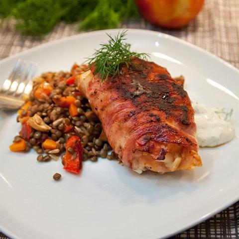 3. Rada upp baconet i fyra grupper på en skärbräda. Kärna ur och hacka äpplet. Lägg äppelhacket i mitten på baconet och lägg laxen ovanpå. Linda ihop baconet runt laxen till ett paket. Stek i stekpanna.