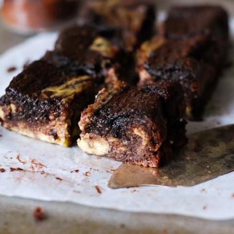 Blanda alla ingredienser och fördela över browniesmeten. Rör med en kniv för att få till ett fint mönster. Grädda i nedre delen av ugnen i ca 35 minuter. Låt svalna och skär i bitar.