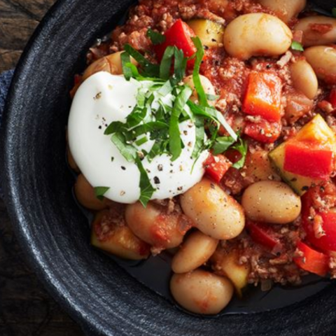 Chili con carne med mustig smak av paprika, lök och squash. En klick crème fraiche och en god sallad ger en extra dimension till Chili con carne.
