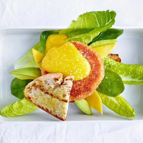 Mumsig laxburgare med mango, avokado och vitlöksaioli. Servera med ett gott bröd eller rotfruktsmos och en fräsch sallad.