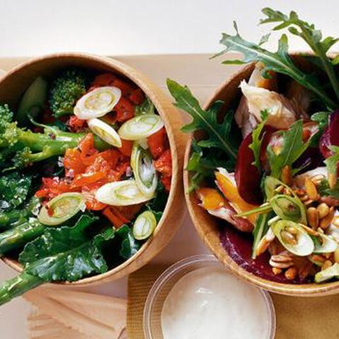 Två snabba och enkla sallader att äta var för sig eller tillsammans. Den första innehåller rödbetor, makrill och pepparrot och den andra sparris och broccoli.